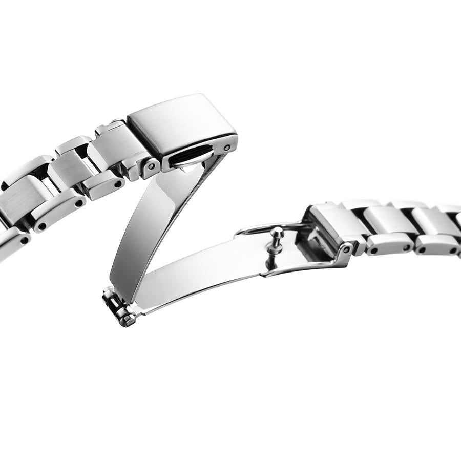 - This gorgeous design combines a unique silver color with platinum for a beautiful, white shine and a navy dial.